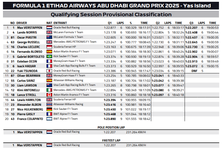 Max Verstappen secured pole position for the F1 Abu Dhabi Grand Prix after a commanding qualifying performance, ending Q3 with a 1:22.207 as the only driver to improve on the final runs. The McLaren duo of Norris and Piastri followed closely behind.