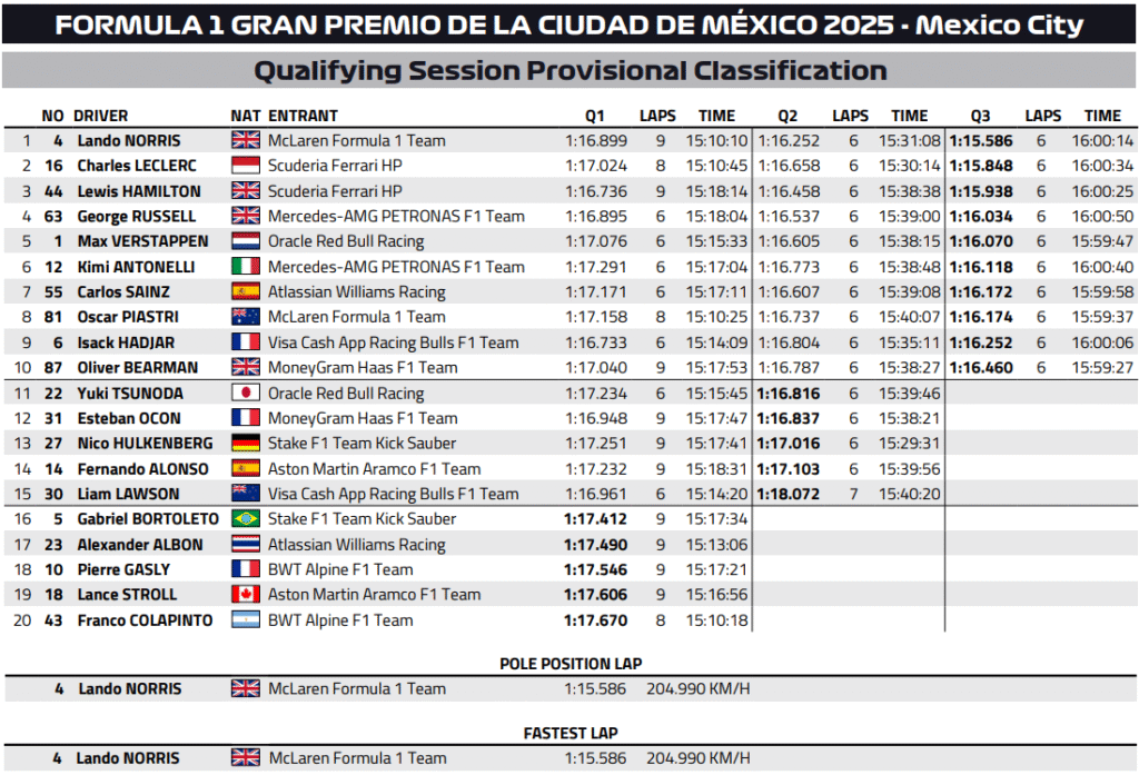 At the end of the qualifying session, the top six was: Norris, Leclerc, Hamilton, Russell, Verstappen, and Antonelli. Piastri was 8th, but he would gain one place due to Sainz’s 5-place grid penalty.
