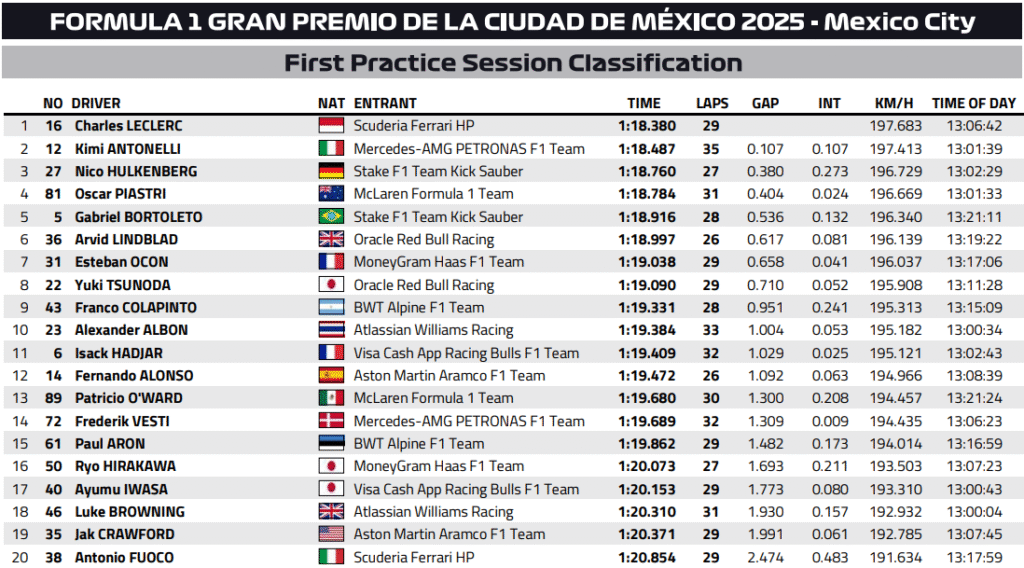 The F1 Mexican Grand Prix weekend kicked off at the high-altitude Autódromo Hermanos Rodríguez, where thin air and dusty asphalt challenged teams right from the start. Friday’s FP1 and FP2 sessions offered a mix of rookie appearances and long-run data gathering, setting the stage for a tight qualifying session. Leclerc and Verstappen topped the charts.