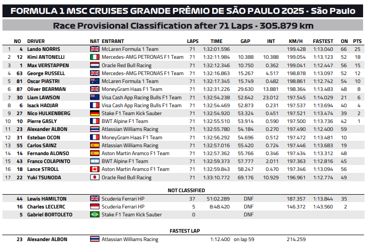 Norris won the race, Antonelli saved the 2nd in front of Verstappen. The Dutchman finished 3rd from pit lane start. Russell 4th, Piastri 5th only. Bearman had a great 6th position.