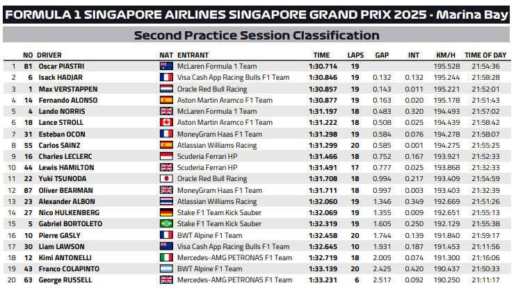 McLaren’s championship leader Oscar Piastri led the way under the lights in second practice, clocking a benchmark lap of 1:30.714. The Australian was pushed hard by Isack Hadjar, who stunned the field by finishing just a tenth behind in his Racing Bulls, while Verstappen once again settled for third.