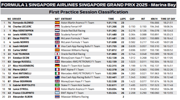 Fernando Alonso was fastest in FP1 and Oscar Piastri led FP2 at the F1 Singapore GP on Friday. The sessions saw crashes, red flags, and a pit lane clash between Norris and Leclerc, with rookie Isack Hadjar delivering a standout performance.